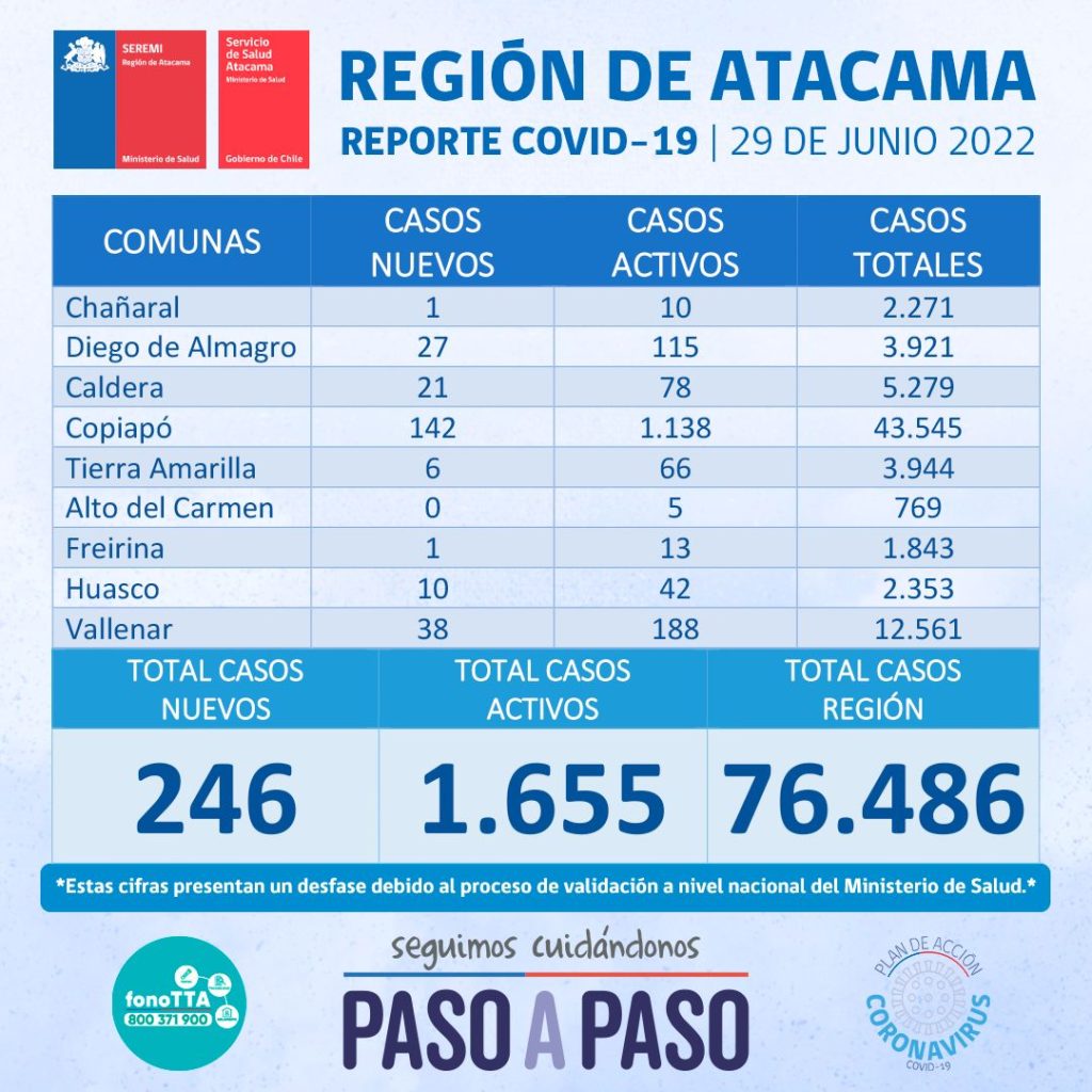 Este miércoles 29 de junio se reportan 246 nuevos casos positivos de Coronavirus en la región de Atacama. 142 casos corresponden a la comuna de Copiapó, 38 casos a la comuna de Vallenar, 27 casos a la comuna de Diego de Almagro, 21 casos a la comuna de Caldera, 10 casos a la comuna de Huasco, 6 casos a la comuna de Tierra Amarilla, 1 caso a la comuna de Chañaral y finalmente 1 caso a la comuna de Freirina.