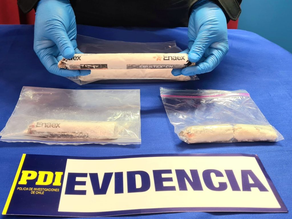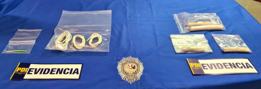 El material incautado por los detectives de la PDI Atacama da cuenta de dos cartuchos explosivos, tres cartuchos incompletos, tres mechas de fuego con fulminante, y una mecha de fuego sin fulminante, especies que en su totalidad están avaluadas en medio millón de pesos.