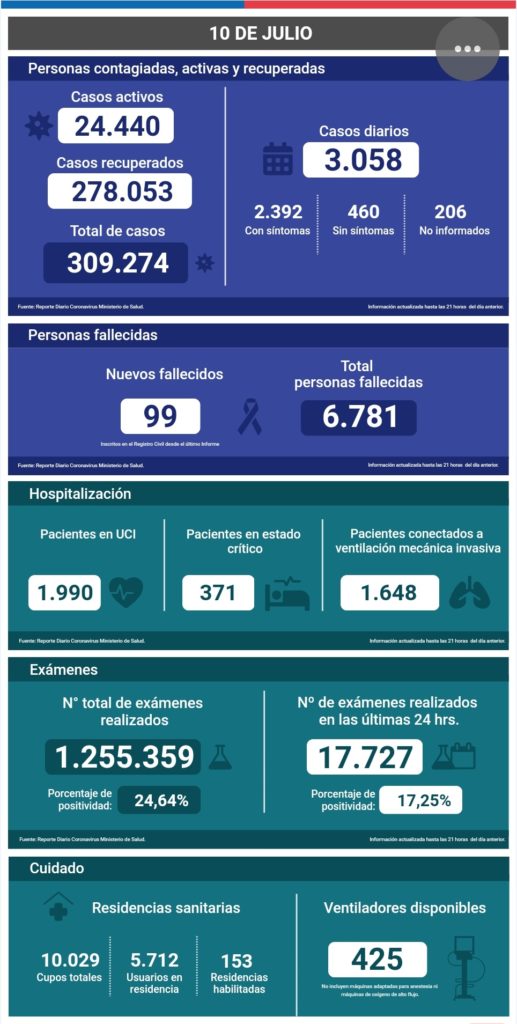 Zúñiga explicó que de los 309.374 afectados por el virus, 24.440 siguen activos, ya que 278.053 se consideran recuperadas por haber transcurrido los 14 días desde el inicio de los síntomas; es decir, más del 95 %. Sin embargo, de los que todavía son altamente contagiosos 8.006 están hospitalizados, cifra que entre el 29 de junio y el 5 de julio comenzó a reducirse con el egreso de 2001 de las redes asistenciales.