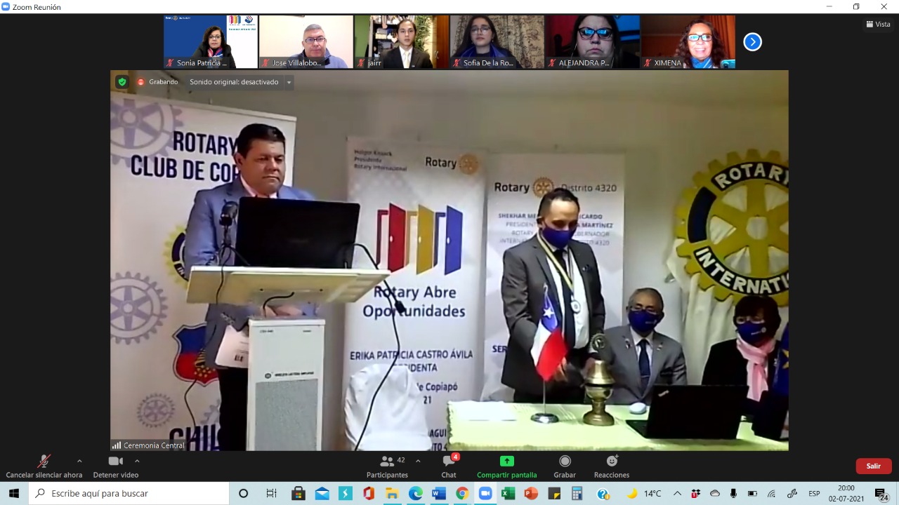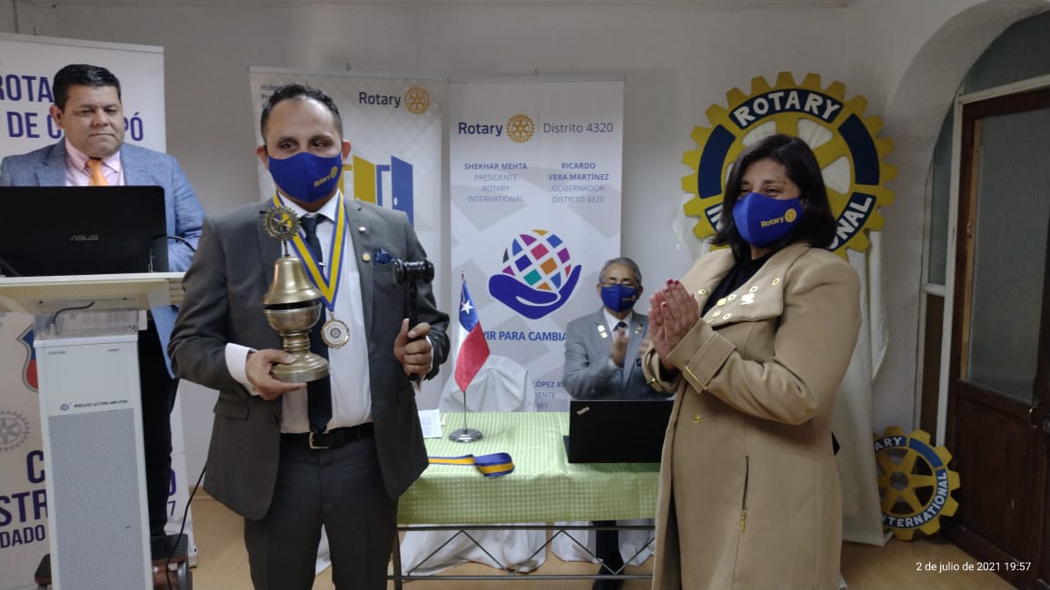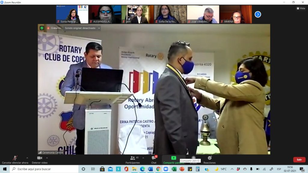 En una ceremonia virtual transmitida por la plataforma ZOOM, se realizó el Cambio de Mando en Rotary Club de Copiapó, donde hizo entrega de la Presidencia la docente Erika Castro Ávila al profesional de la salud, el kinesiólogo Alejandro López Rivera.