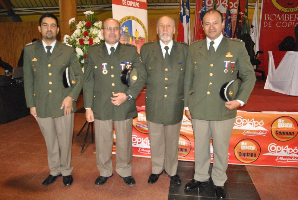 DE IZQUIERDA A DERECHA.- El segundo voluntario que aparece en la fotografía recuerda a Douglas Sapiains recibiendo una de las tantas condecoraciones en Bomberos.