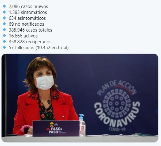 Con la detección de estos nuevos contagiados, además de la suma de 69 personas que ya tenían su diagnóstico, pero no habían sido informados al Ministerio de Salud (Minsal), el total de la última ronda de pesquisa fue de 2.086, lo que eleva el total de individuos que han tenido o tienen el virus a 385.946, de los cuales 358.828 se han recuperado y 10.452 han muerto.