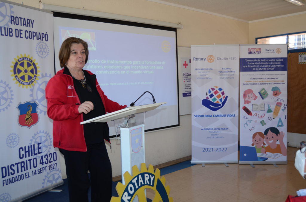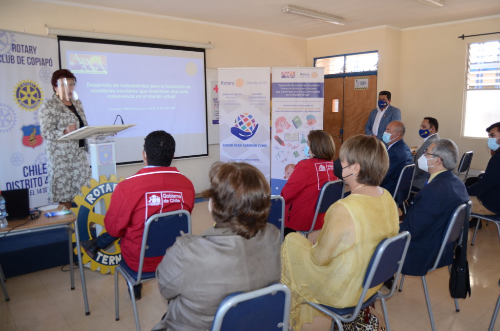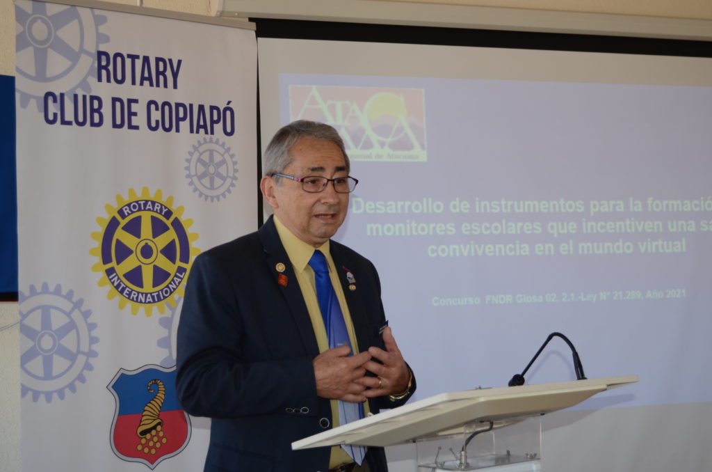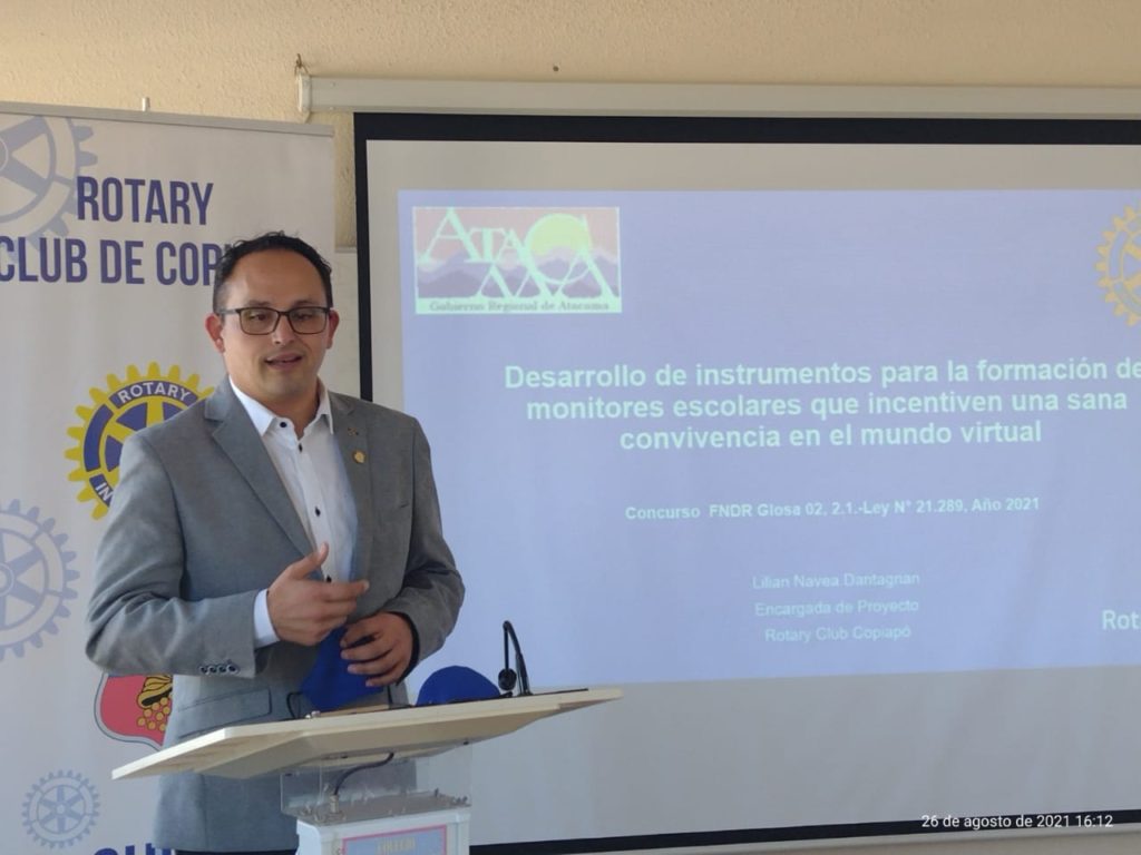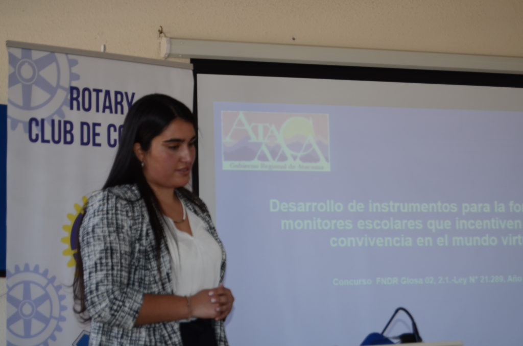 Fue así como el club rotario copiapino realizó ayer de manera presencial una ceremonia de lanzamiento del Proyecto: «Desarrollo de Instrumentos para la Formación de Monitores Escolares que Incentiven una Sana Convivencia en el Mundo Virtual», adjudicado por a través del Concurso FNDR Glosa 02, 2.1 Ley N° 21.289 Año 2021 del Gobierno Regional de Atacama.