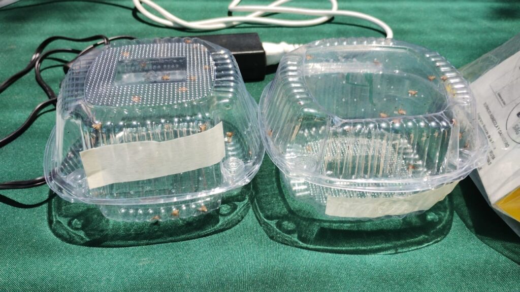 En la práctica, se instalan bolsas de papel en algunos árboles, desde las cuales, una vez abiertas, salen las moscas al medio ambiente. A diferencia de la mosca común, la de la fruta solo habita en la copa de los árboles, por lo que existen muy pocas probabilidades que generen molestias.