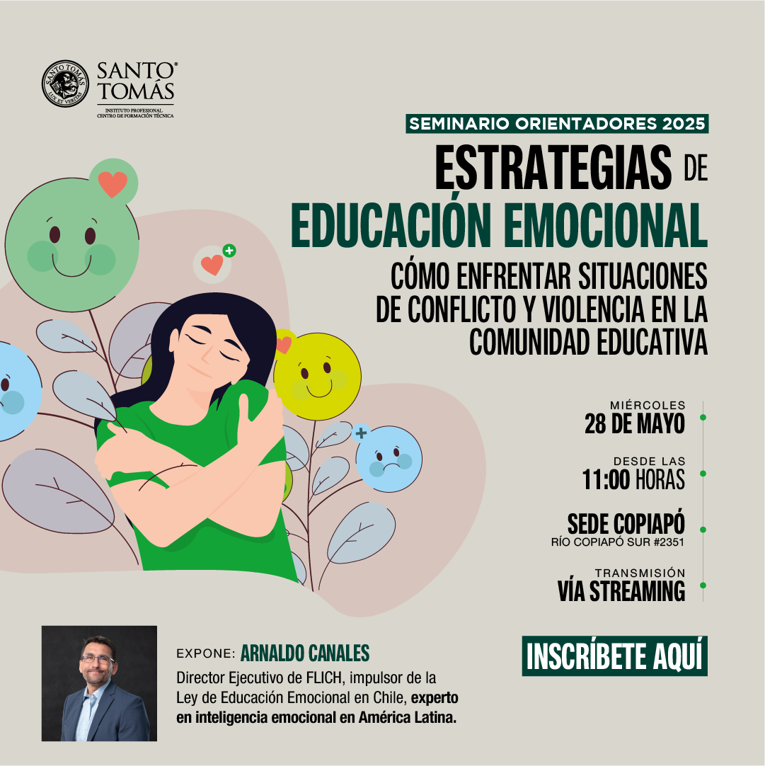 En este seminario, que se desarrollará el miércoles 28 de mayo a las 11:00 horas en el salón auditorio “Monseñor Gaspar Quintana” de Santo Tomás Copiapó, se trabajará en cómo enfrentar situaciones de Conflicto y Violencia en la Comunidad Educativa y será dictada por Arnaldo Canales, director ejecutivo de FLICH e impulsor de la ley de educación emocional en Chile, además de experto internacional en dicha materia.