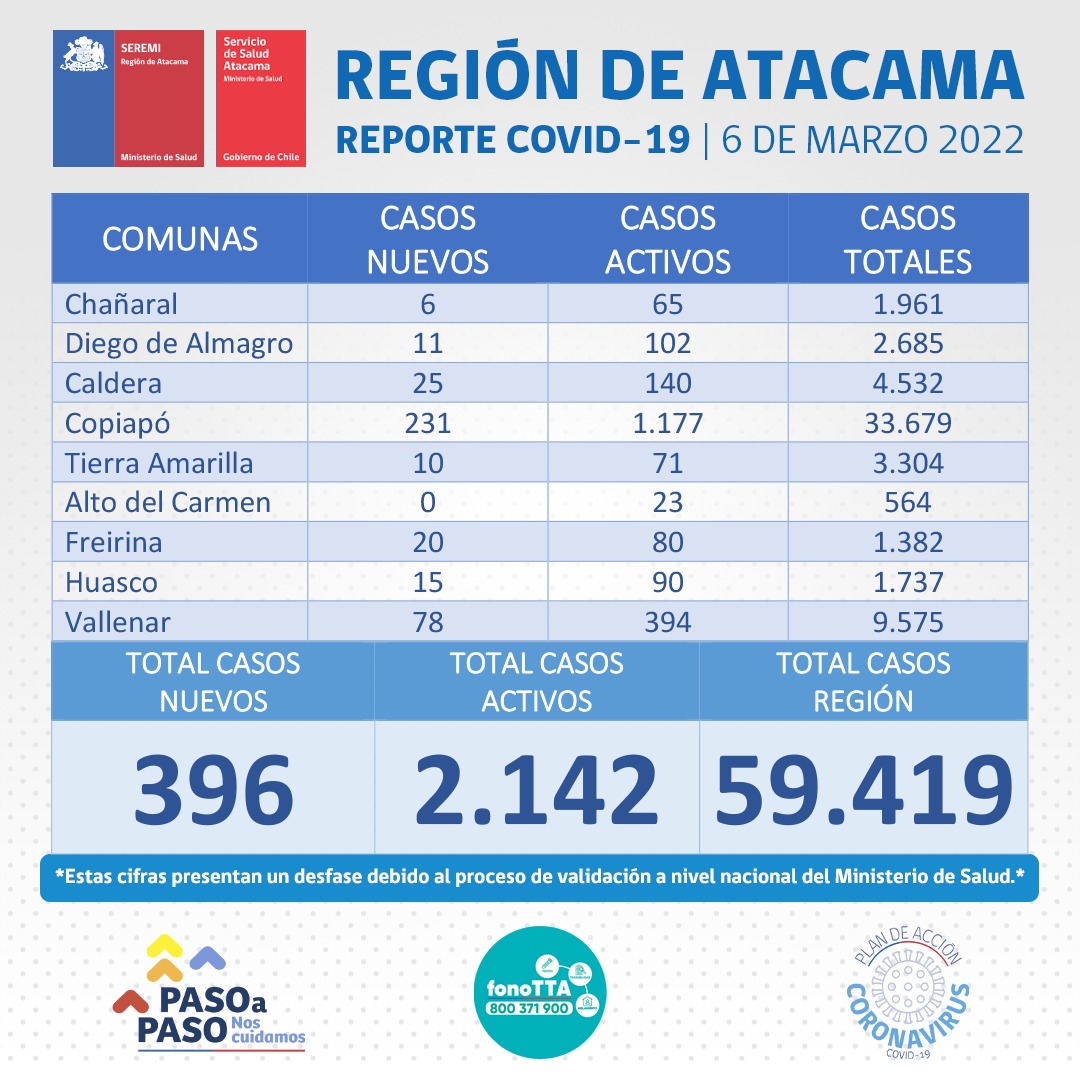 Ayer domingo 6 de marzo se reportaron 396 casos nuevos positivos de Coronavirus en la Región de Atacama.