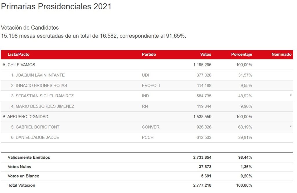 Los grandes triunfadores resultaron Sebastián Sichel y Gabriel Boric y serán los candidatos en noviembre próximo.