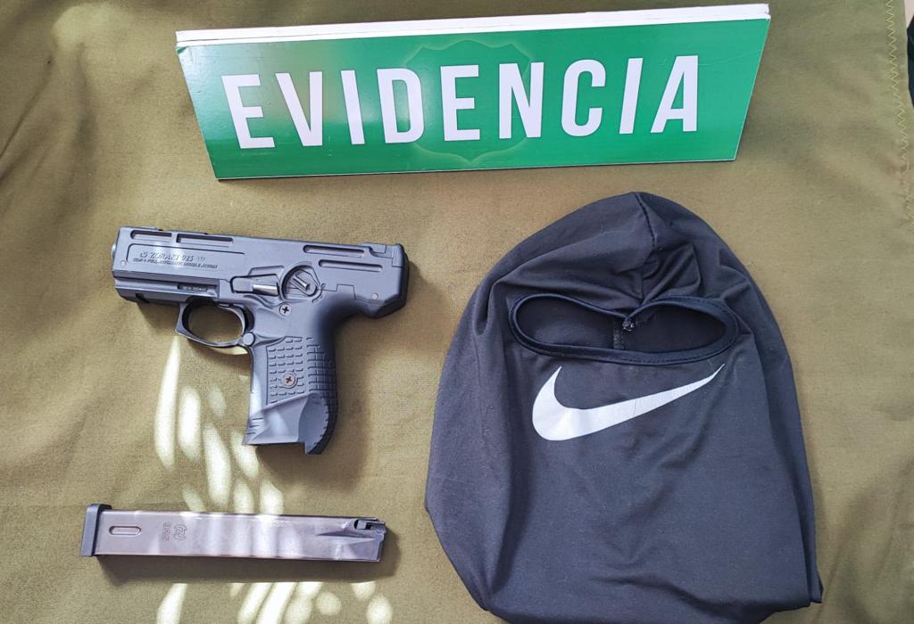 Además, se realizó una revisión del vehículo encontrando bajo el asiento del acompañante un arma aparentemente de fantasía (fogueo), y una pasamontañas color negro.