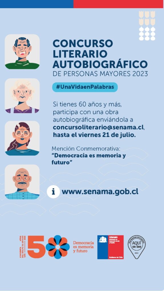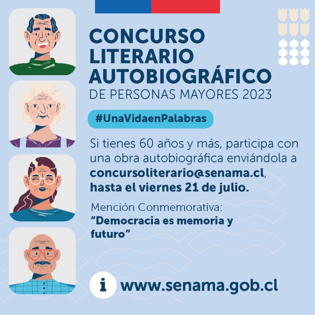 El Servicio Nacional del Adulto Mayor anunció el Noveno Concurso Literario Autobiográfico de Personas Mayores con el que se busca «contribuir al envejecimiento activo de personas mayores en situación de vulnerabilidad social, proporcionando oportunidades para el desarrollo personal, cognitivo, y de participación social, para lo cual se requiere fomentar y equilibrar la responsabilidad  personal, el encuentro, la solidaridad intergeneracional y la creación de entornos favorables, que aporten a la calidad de vida y retrasen los niveles de dependencia», señalaron desde SENAMA.