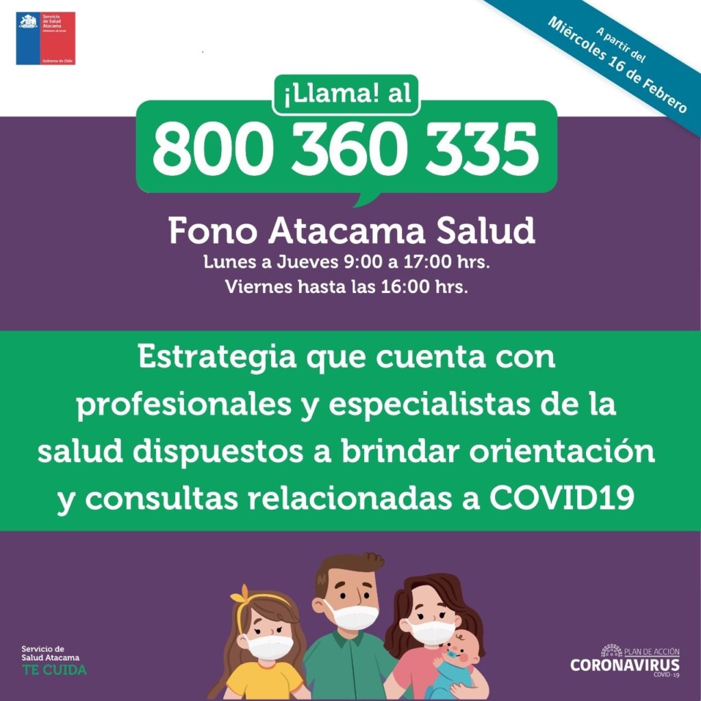 Con el objetivo de hacer un buen uso y reforzar la Red Asistencial de la Región de Atacama, el Servicio de Salud Atacama volvió a habilitar la Central Telefónica Fono Atacama Salud 800 360 335, línea y canal de comunicación que busca acercar la información a la gente, y resolver dudas de la ciudadanía en relación al Covid 19.