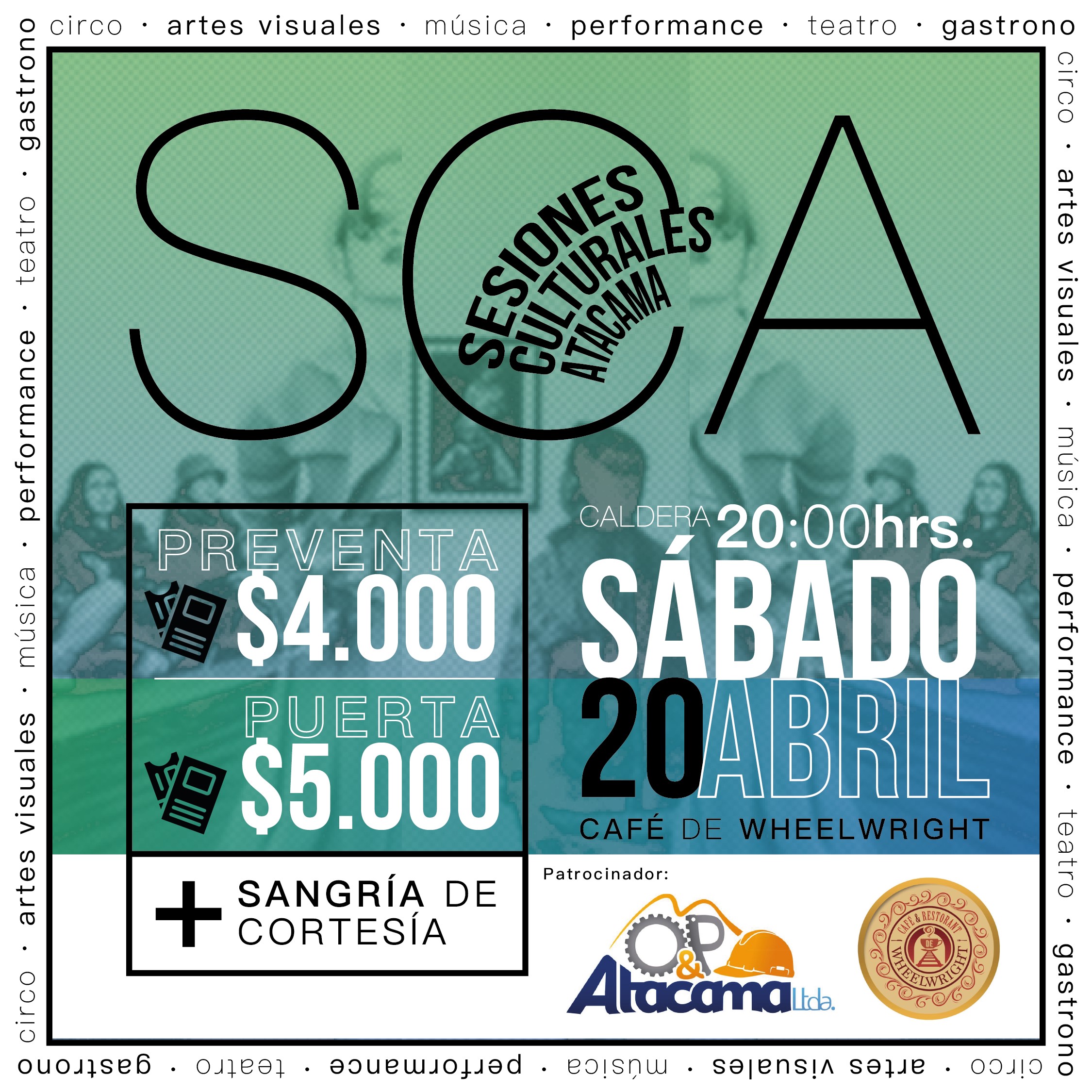Con una clara visión de convertirse en un epicentro cultural constante, el proyecto aspira a ser reconocido a nivel regional y nacional, ofreciendo un espacio inclusivo y accesible que fomenta la creatividad, la experimentación y la innovación artística de manera itinerante. Con más de un año de vida, y desde hoy apoyados por O&P Atacama Ltda. y la cafetería que confió en la idea desde el primer momento, el proyecto de Valeska Ávalos Prado, Francisco Javier Vega, Francisca Figueroa Rojas y Francisco López Urquieta ofrecerán a la comunidad su Sesión VII, con una programación llena de destacados artistas, contarán con la performance de Omi Campos Castillo, el folklore de Marcela González, un monólogo de Ian Cortés, el acro-dúo de Camila Guzmán y Dayan Araya, entre muchas propuestas más, Sesiones Culturales Atacama los espera este sábado 20 de abril desde las 20:00 horas en el Café de Wheelwright, ubicado en plena costanera de la playa mansa del puerto de Caldera.