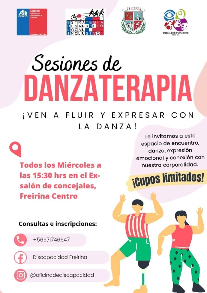 Entonces, la Unidad de Discapacidad de Freirina ¡te invitamos a participar de sesiones de danzaterapia! en donde a través de nuestro cuerpo y movimientos, nos conectamos con nuestras emociones, desarrollamos la creatividad, autoestima, mejoramos nuestro estado de ánimo, etc.