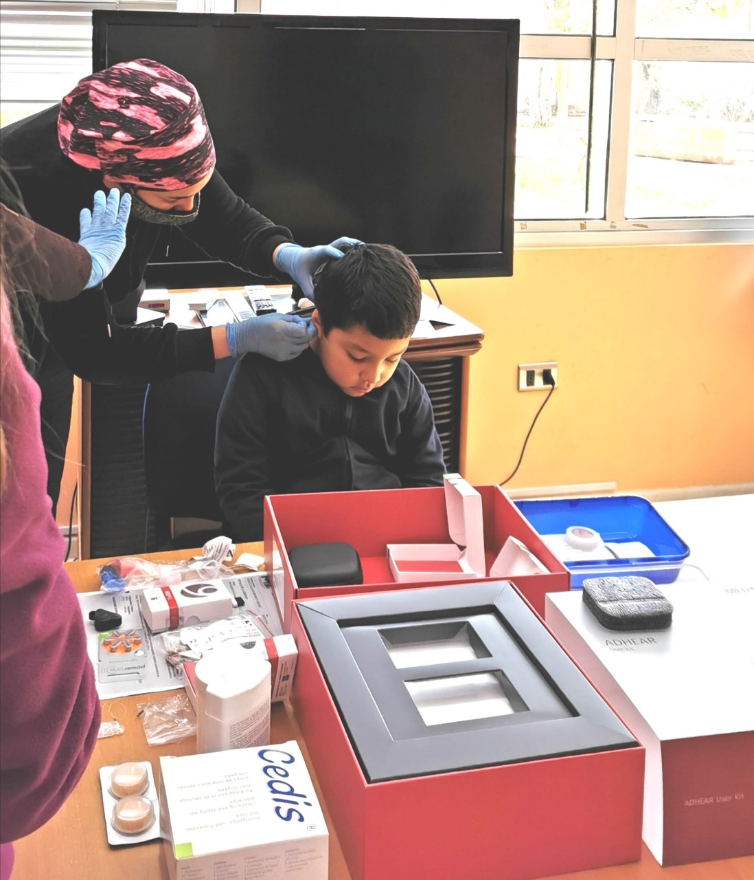 La Directora Regional de Junaeb, Claudia Alvayai junto al equipo del Servicio de Otorrinolaringología liderado por la Dra. Paola Neumann, se reunieron con la familia de Renato a fin de instalarle este moderno audífono. Sin duda un hecho que recordará y tendrá un impacto positivo en la vida del joven estudiante. “Con un adhesivo a la piel se inserta el procesador de audio atrás de la oreja y mediante la vibración ésta se transmite directamente hacia el oído interno” expresó la médico especialista en otorrinolaringología.