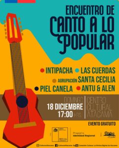 La parrilla de eventos continúa el domingo a las 17:00 horas en el Centro Cultural con el concierto “Canto a lo Popular”, encuentro musical que tendrá en el escenario a destacados de la música regional, como lo son IntiPacha, Las Cuerdas, la Agrupación Santa Cecilia, Piel Canela, y desde Huasco a Antu & Alen, en el marco de las acciones del programa Fortalecimiento de la Identidad Cultural Regional.