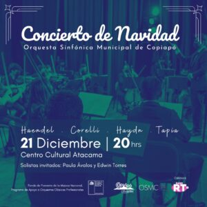 En tanto, el miércoles 21 de diciembre desde las 20:00 horas en el Centro Cultural de Atacama, la comunidad podrá disfrutar del tradicional “Concierto de Navidad” de la Orquesta Sinfónica Municipal de Copiapó que es parte de las presentaciones consideradas en el programa de Apoyo a Orquestas Clásicas Profesionales por medio del Fondo de Fomento de la Música Nacional.