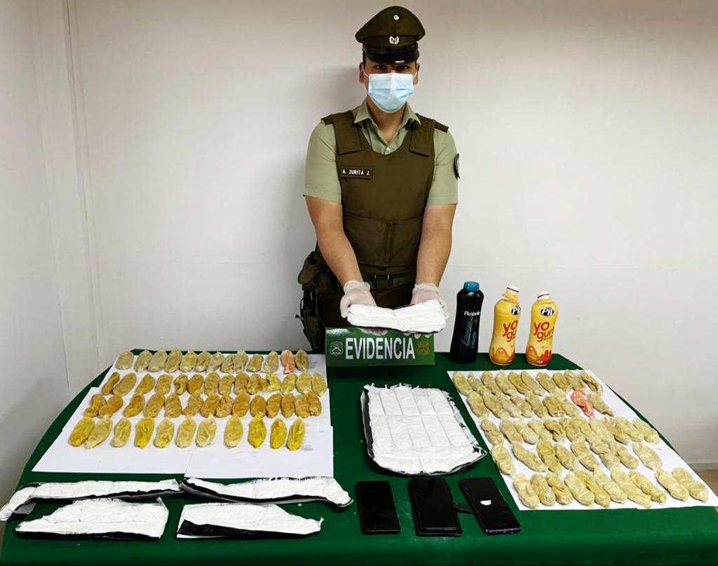 Los imputados, informó el jefe de la Sección OS7 Atacama, capitán Eugenio Olea, intentaban pasar la droga a través de ovoides, los cuales llevaban en el interior de su organismo. También llevaban en el interior de una mochila Ketamina en polvo.