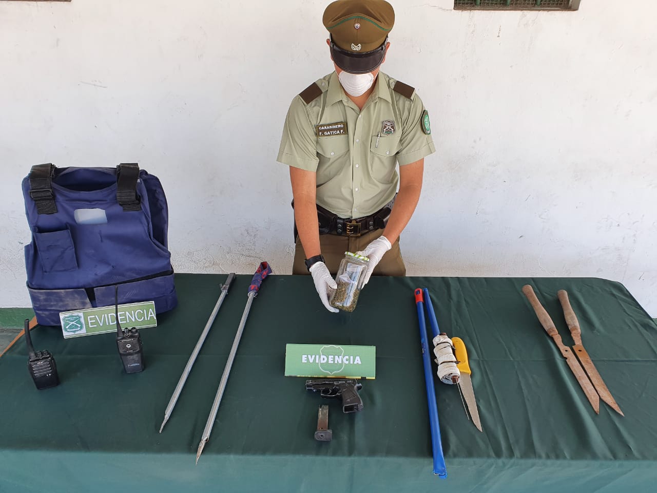 Del mismo modo se hace presente que en el domicilio antes mencionado de los imputados se incauto un chaleco anticorte de color azul, una portátil de color negro, una motorola modelo EP450S y una portátil de color negro modelo TYT-t5. además de un frasco trasparente en su interior contenedor de una sustancia de color verde con similares características y olor a la marihuana, la que fue llevada a dependencias de os-7 atacama con la finalidad de efectuar prueba de campo y pesaje arrojando coloración positiva de marihuana.