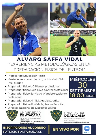 El Departamento de Educación Física Deporte y Recreación, junto al Área de Actividad Física y Deporte de la Universidad de Atacama invitan a la conferencia: «Experiencias metodológicas en la Preparación Física del Fútbol a cargo del profesor Álvaro Saffa Vidal.