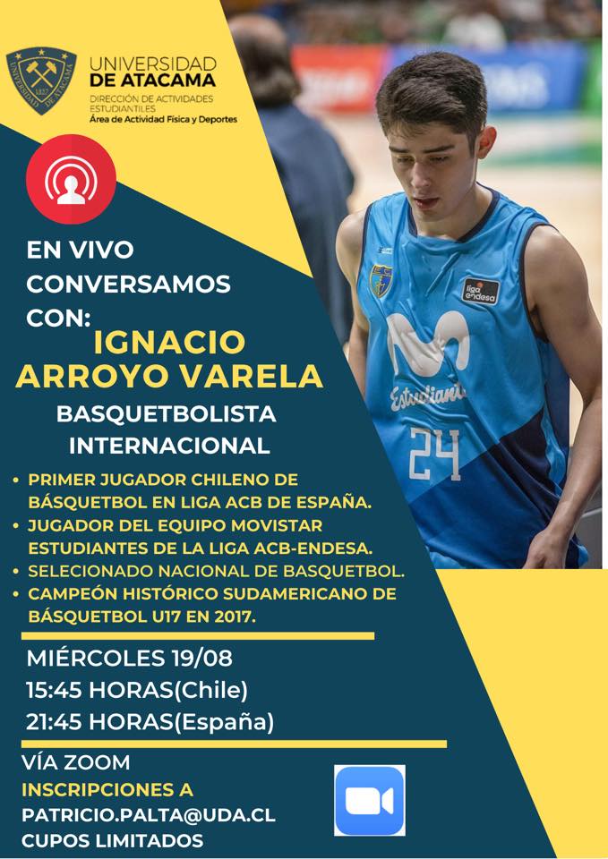 El Departamento de Actividad Física y Deportes de la Universidad de Atacama continúa con el ciclo de conversatorios, en esta oportunidad y semana se contará con la presencia (de manera virtual) con Ignacio Arroyo Varela, quien estará hablando acerca de su trayectoria como basquetbolista internacional