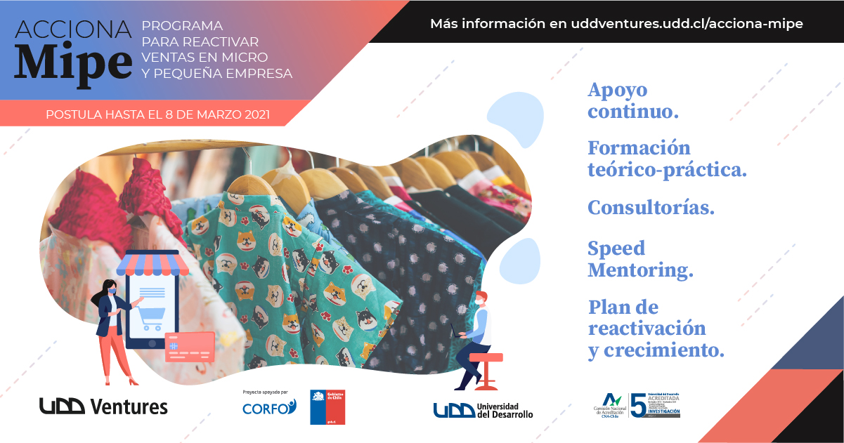 UDD Ventures, la aceleradora de negocios de la Universidad del Desarrollo, abre la convocatoria ‘Acciona MIPE’ para apoyar a las Micro y pequeñas empresas (MIPE) nacionales que se hayan visto afectadas por la crisis económica, a través de un programa formativo en temáticas especialmente diseñadas para potenciar la estrategia comercial y poder así aumentar las ventas. La convocatoria se realiza entre el 11 de enero y el 8 de marzo.
