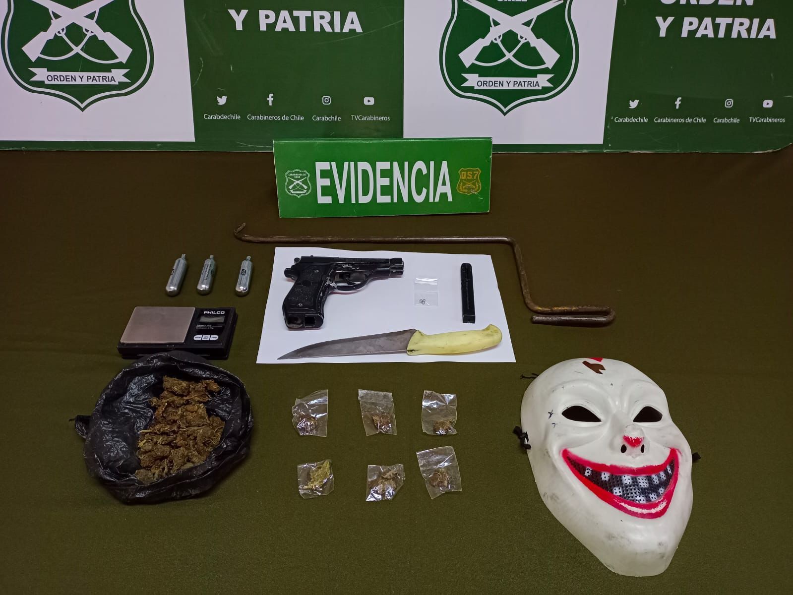 Producto de este hecho policial se logró incautar una Pistola de aire Comprimido, 55 gramos 300 miligramos de Marihuana, un cuchillo de 30 Cm de hoja, una Ganzúa, una máscara y otras Evidencias Asociadas al ilícito.