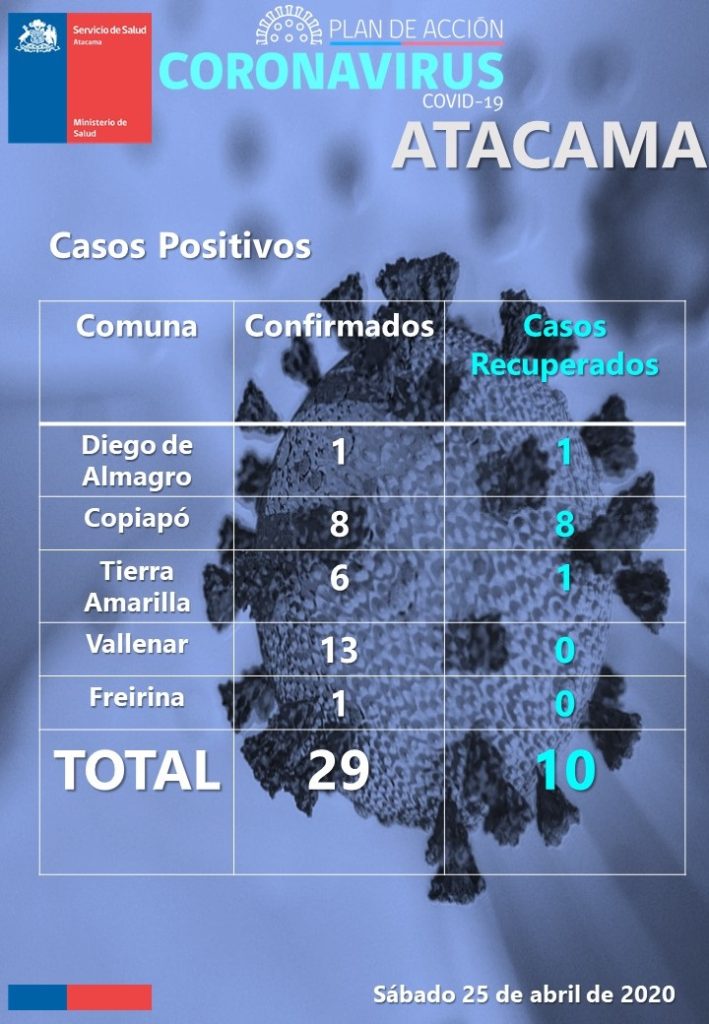 Con un escueto comunicado la institución actualizó la cifra de contagiados que, hasta ese momento, era de 29 personas y después subió a 34 en todo el territorio regional, de las cuales 10 han recibido el alta médica, tras cumplir sus procesos de cuarentena y -según el director del Servicio de Salud, Claudio Baeza- dar negativo a las pruebas de PCR de salida, recomendadas por el personal de visita domiciliaria.