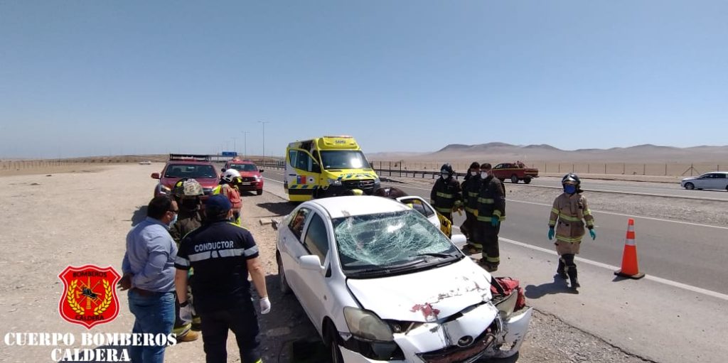 Durante la mañana de este martes personal de Bomberos y SAMU acudieron al kilómetro 865 de la Ruta 5 Norte, lugar en que se produjo el choque y volcamiento de un vehículo menor.