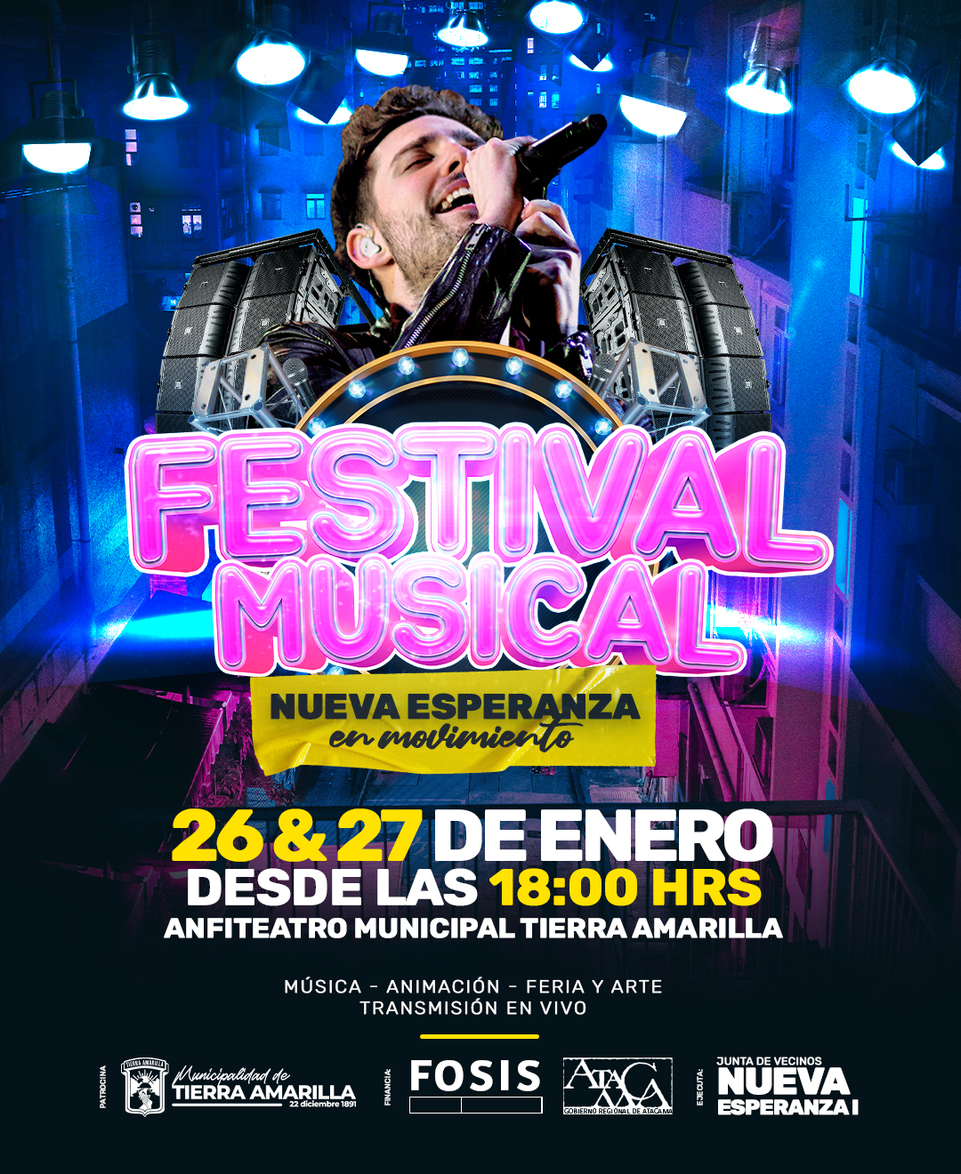 La Junta de Vecinos Nueva Esperanza I, en colaboración con la Municipalidad de Tierra Amarilla, Fosis y el Gobierno Regional de Atacama, invitan a toda la comunidad al «Festival Musical Nueva Esperanza en Movimiento».