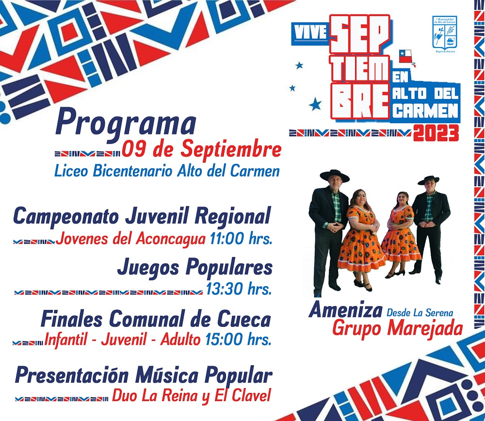 Hoy sábado 09 de septiembre desde las 11.00 horas, se desarrollará en el Liceo Bicentenario de nuestra comuna las finales por categoría de la 2ª versión de Vive la Cueca Alto del Carmen. En la ocasión además se vivirá el Campeonato Regional «Jóvenes del Aconcagua», donde la pareja ganadora representará a la Región de Atacama en el Nacional del mismo nombre.
