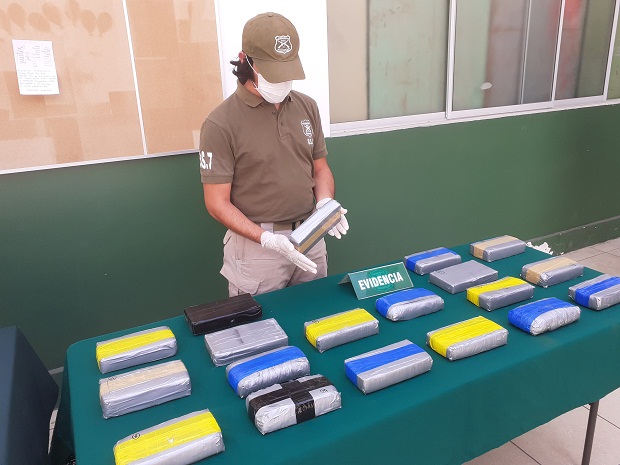 Más de 20 kilos droga entre pasta base de cocaína y clorhidrato de cocaína detectó el ejemplar canino del OS7 Atacama “Darwin”, durante un control vehicular a un bus interprovincial en el sector del kilómetro 752 en la comuna de Copiapó.